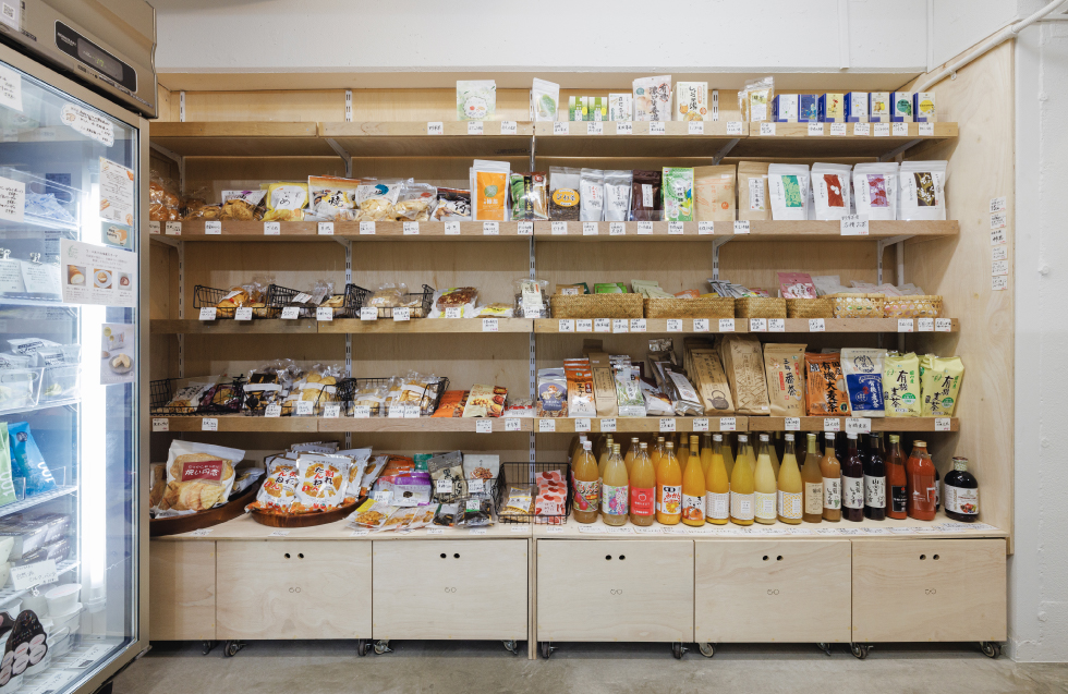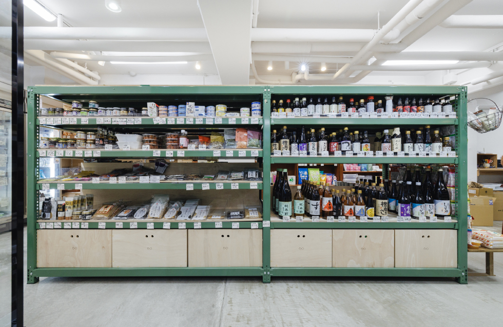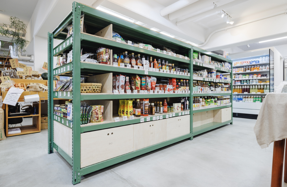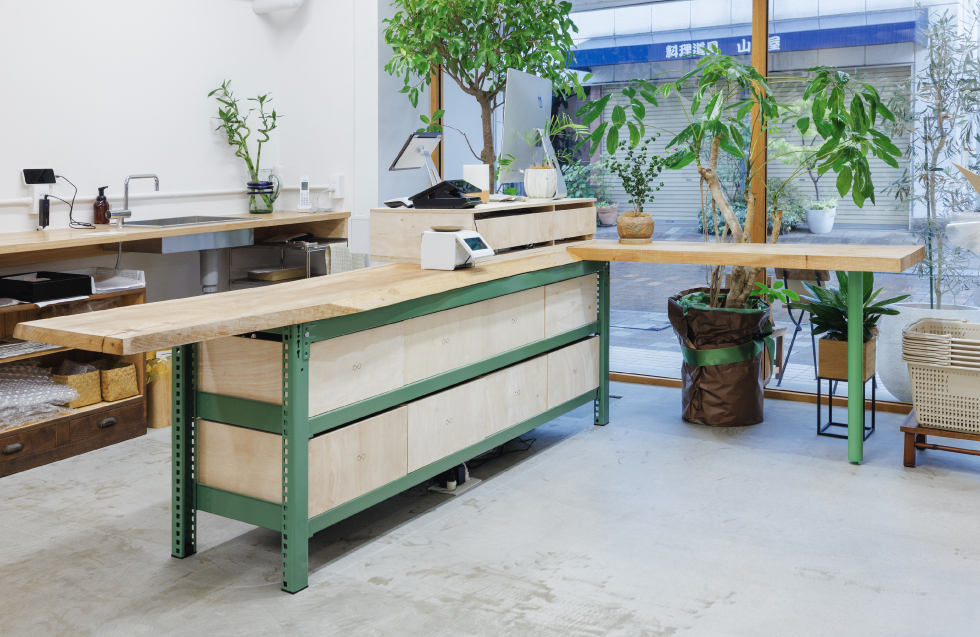 陳列棚・レジ台の脚にはスチール棚を用いた。木と合わせることで、無骨な中にもあたたかさを感じられるような空間を目指した。