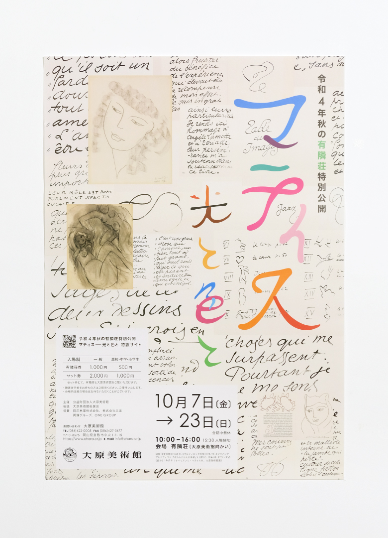 大原美術館が主催する「令和 4 年秋の有隣荘特別公開 マティス-光と色と」のポスター、チラシ、パンフレットデザインを担当させていただきました。