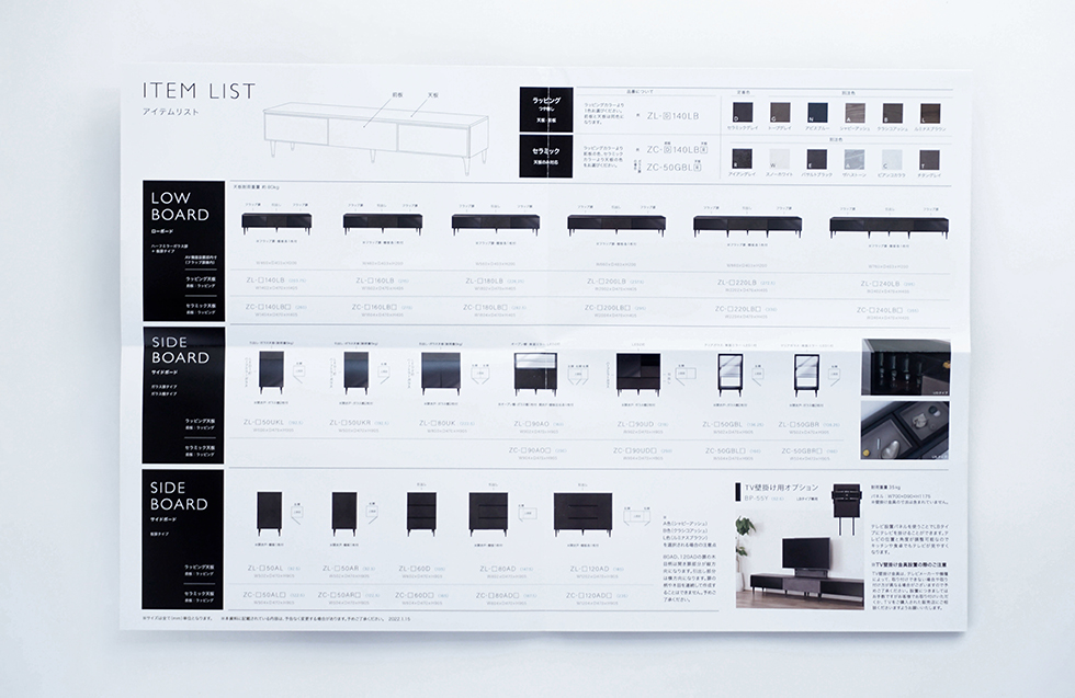 カタログは機能性、スペックをイラストを用いながら、しっかりとまとめた。表紙、裏表紙には商品のカラーバリエーションを大きめに配置。裏面にあるポスターは、XENOシリーズの特徴であるアジャスターをモチーフに天板のカラーと綾野製作所の赤色でシンプルに構成した。