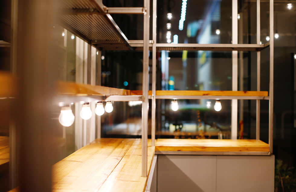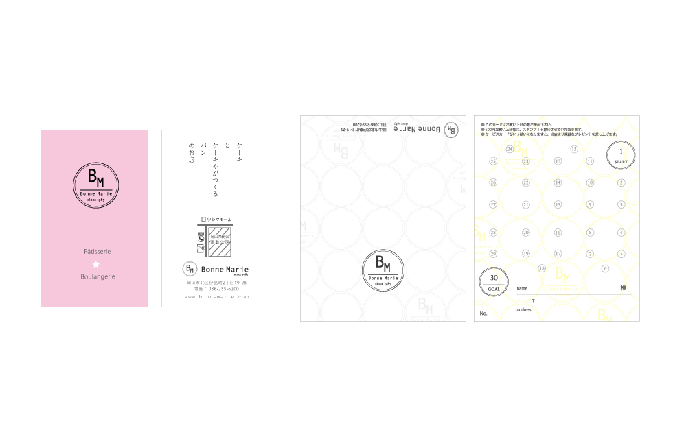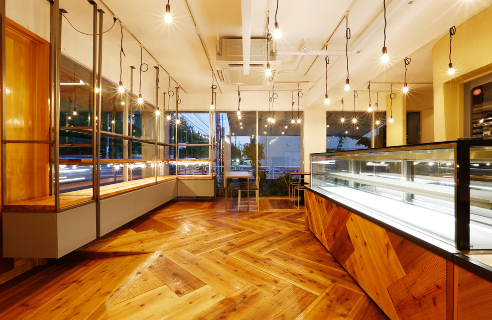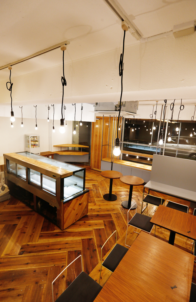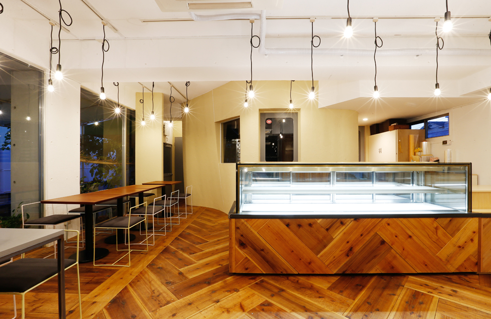 まちのケーキ屋さん「ボンヌ・マリー」様の改装計画にともなっての店舗設計、ロゴやショップカードなどのグラフィックデザイン、イスのリメイクなどトータルで担当。 大通りと運動公園に面した大開口の窓を活かし、見通しの良い明るい店内にし、気軽に立ち寄りやすい雰囲気を意識した。 今回の改装のメインとなるパン工房は、パン生地の柔らかいイメージをそのまま、3次元曲面の左官仕上げの壁にし、お店の中心にシンボリックに浮かび上がるようにした。 LED裸電球を整然と配置し、空間に明るさと立体感を演出。 床や什器には、荒い表情のバタ板と鉄骨をクリア塗装して用い、かしこまりすぎないような素材使いを心がけた。