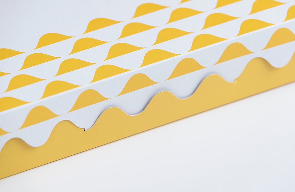 6個入箱は、蓋の閉じしろ部分に波状のカットを入れることで、個包装と同様のパターンを表現。