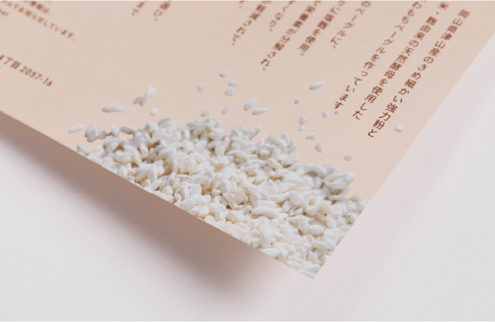 チラシには、からだのことを思いやっていることが伝わるように、材料として使っている米麹も用いた。HANA Bagelの魅力の一つでもある、旬の食材に合わせたバリエーション豊かなベーグルの写真も使い、どんなベーグルを作っているのか想像できるようにした。