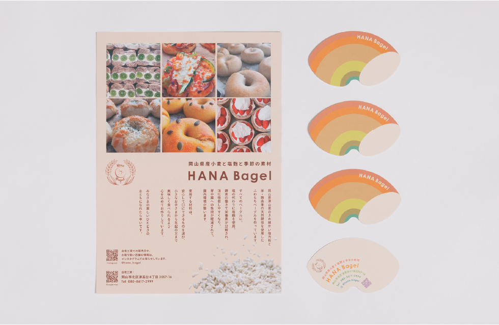 岡山県岡山市の自宅工房でベーグルを販売している「HANA Bagel」のショップカード、チラシのデザインを担当した。