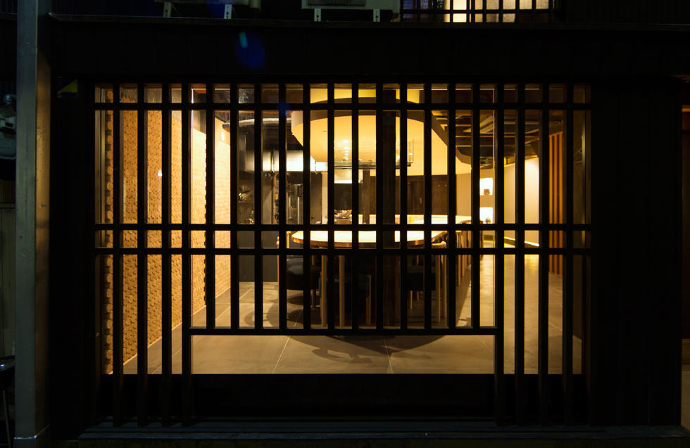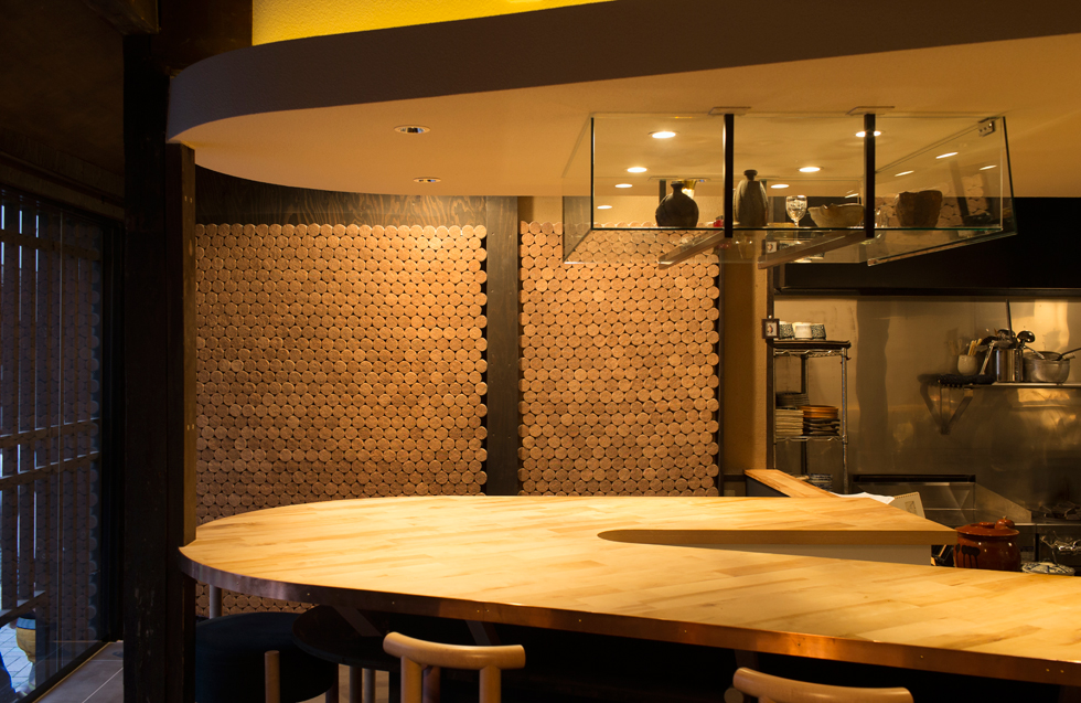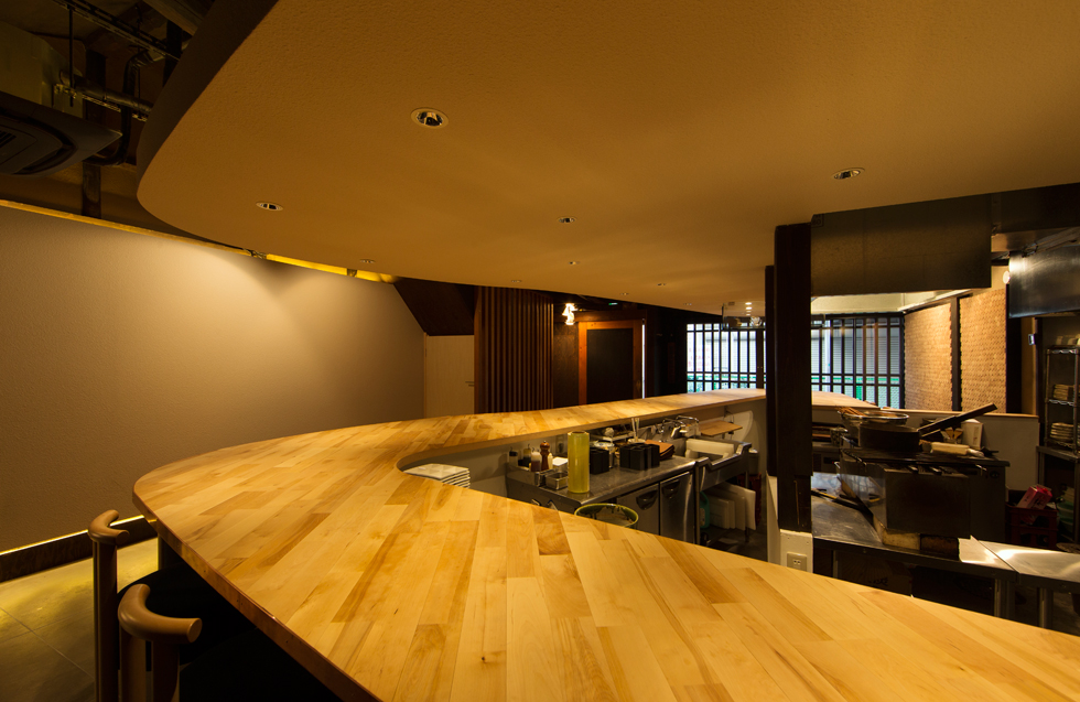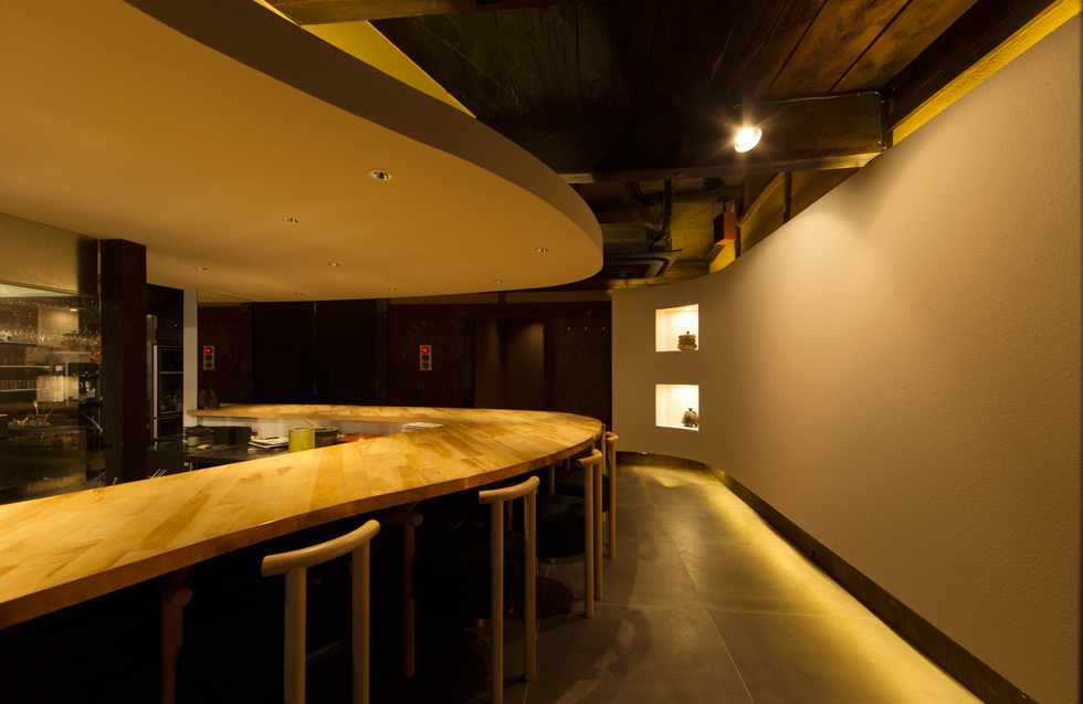 かしわ屋こばやしさんの新装計画の店舗設計、家具デザインを担当。 こばやしさんは元々こだわりの焼き鳥を提供される有名店であるが、10年目を迎え、オーナーがもう一度より良い店作りという 観点から初心にかえりサービス、料理の提供スタイルを見直したいということでのご依頼。 今回の計画では、テーブル席をなくし、「舞台」である焼き場を中心に出来るだけ席数を確保できる長さを探りながら 円を描くようにカウンターを配置する計画とした。 カウンターは桜の無垢材、木口は銅板で抑える仕上げ、厨房内天井はカウンターと 同じ形状でフラットに天井高も低めに設定、カウンター内の厨房が「舞台」のように切り取られる。 カウンターに配する椅子もオリジナルでデザインした。 また、店名の書体はオーナーがファンでもある備前焼作家の隠崎隆一さんに依頼し書いていただいた。