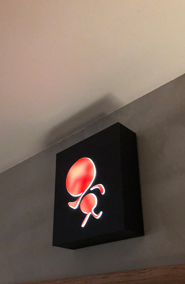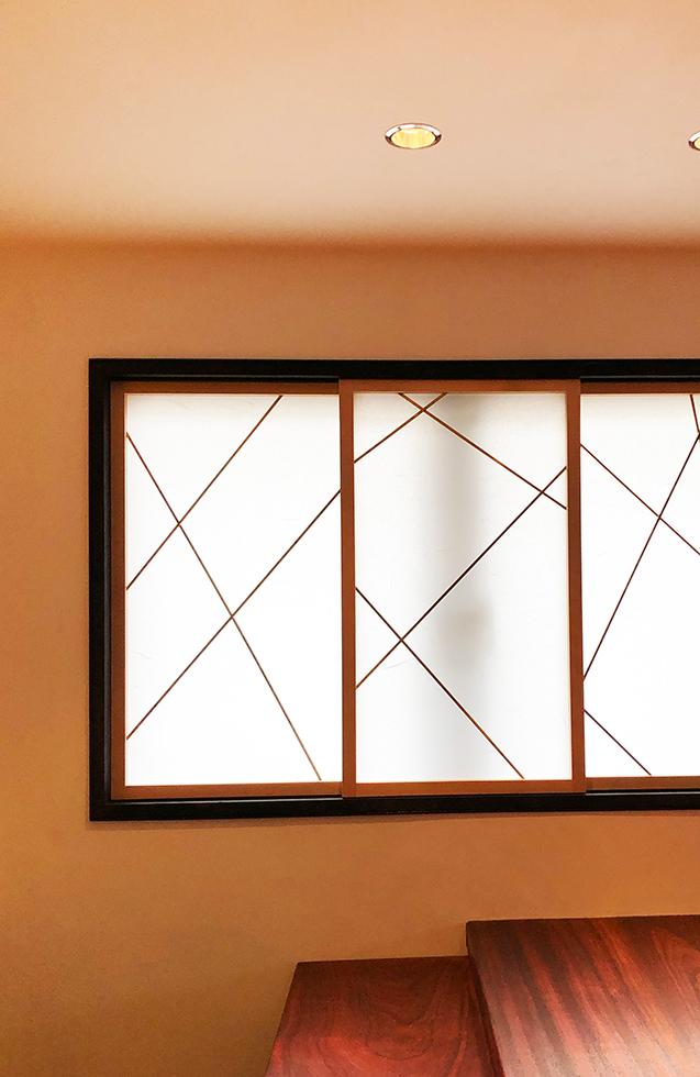 ネームのカタカナが見えてくる格子障子、ロゴをモチーフにした棚、関節照明、