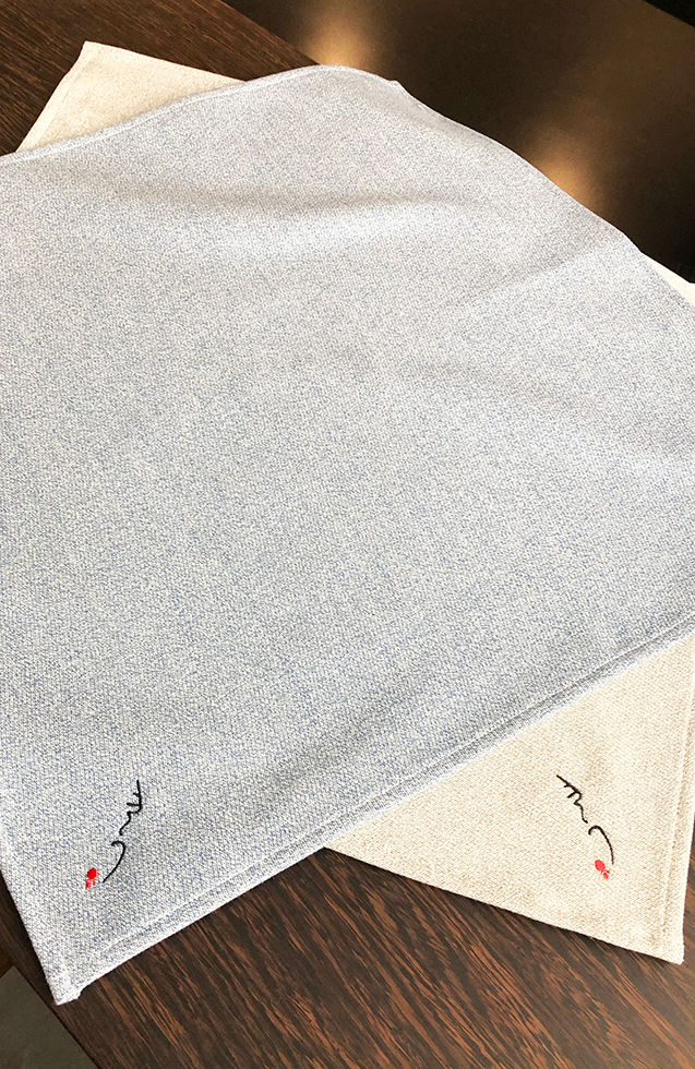 シンボルマークを擬人化した照明カバー、備中小倉織のひざ掛けなど、すべてオリジナルで製作した。