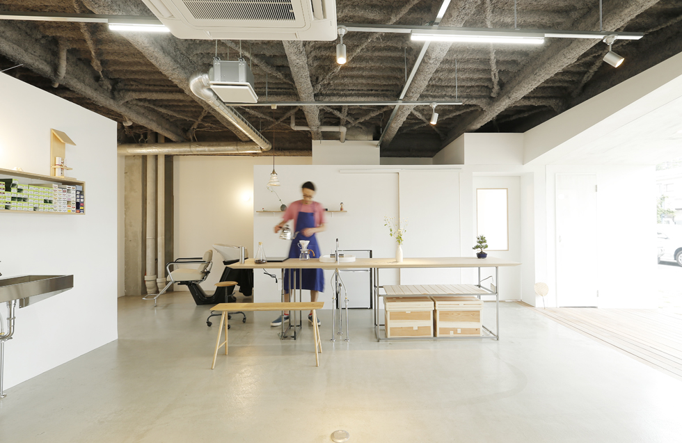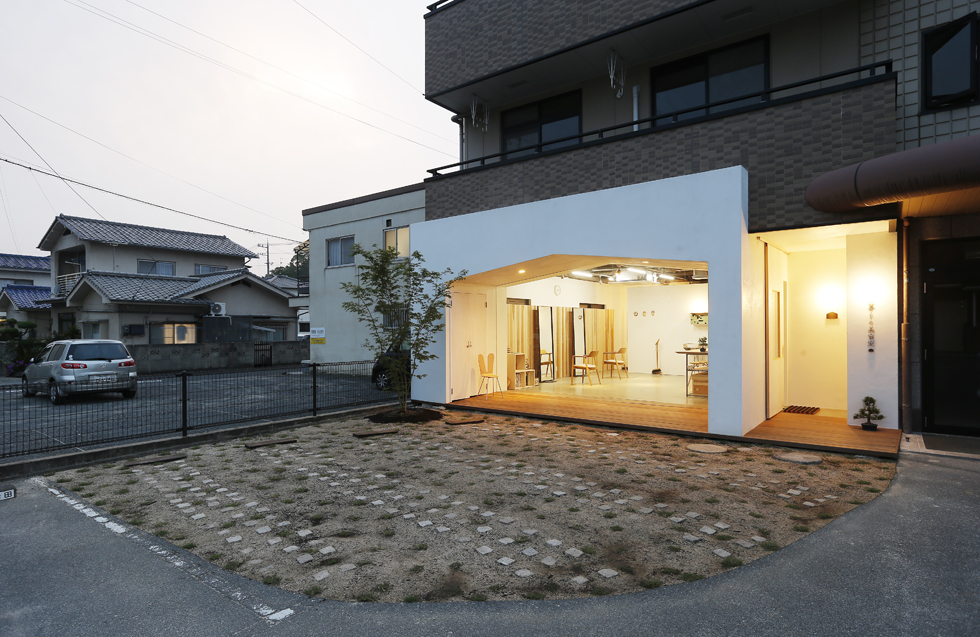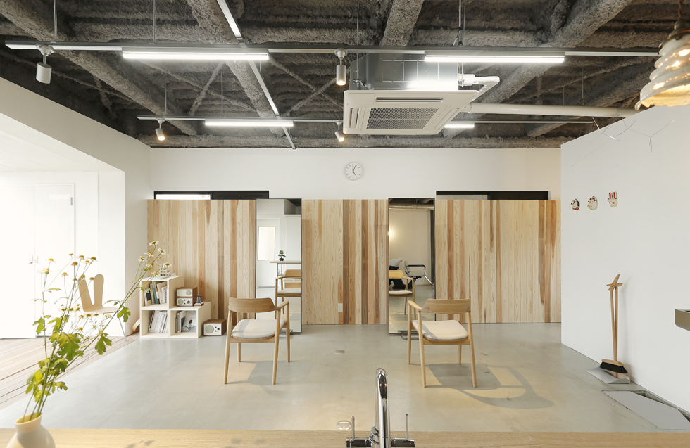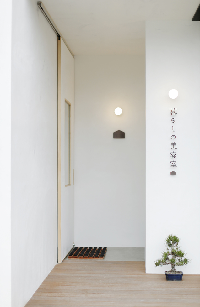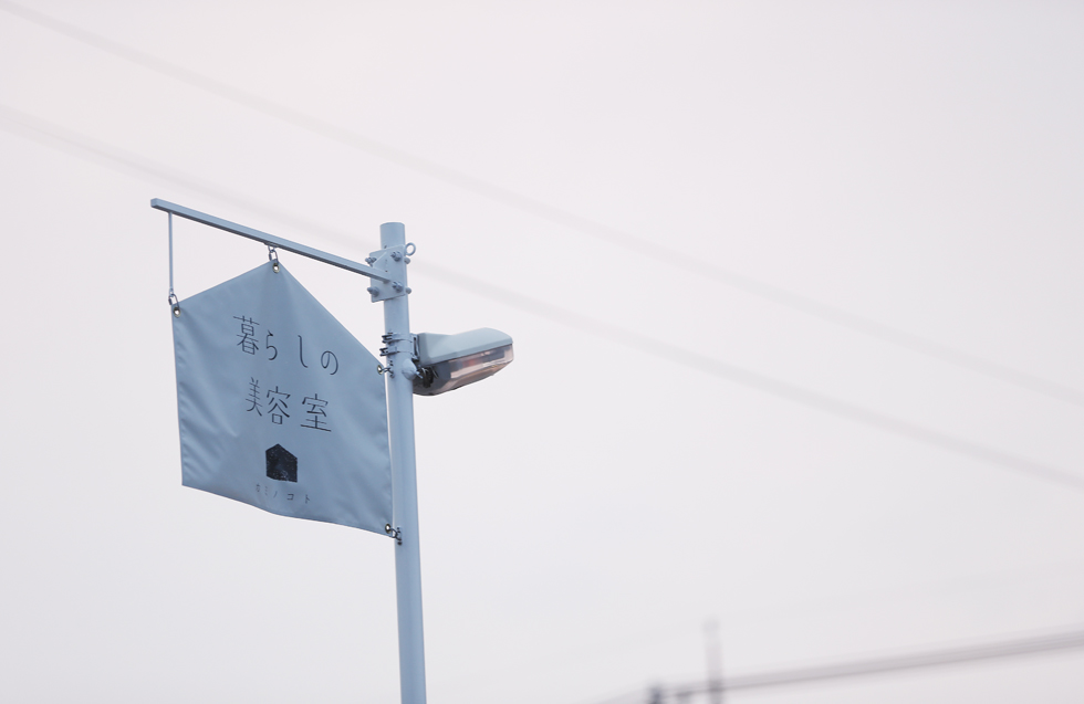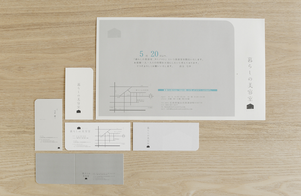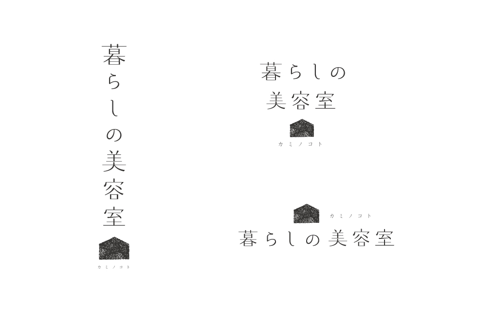 広島の福山市で新しく開業される小さな美容院「暮らしの美容室 カミノコト」の新装計画。店舗設計、ロゴや紙媒体等のグラフィックツールなどをトータルで担当させていただいた。 モノや暮らしが好きでそれらを高い次元で昇華させ楽しんでいらっしゃるクライアントの印象から、空間やグラフィックツールは出来る限りそぎ落としつつ素材の表情を大切にまとめていくような処理を目指し、「モノ」がよりいきるような場所を目指した。 また、物件が比較的交通量の多い道路に面した、いわゆるふつーの3階建てのメーカー物のアパートの1階に位置してる為、そこに異物を挿入するような、違和感をうみながら外へもアピール出来うるような外観を目指した。 シンボルマークにも展開しているイエのようなカタチのマークで切り取ったファサードの大きな窓が風景を切り取りつつ、前面の駐車場スペースのアスファルトをカットして植栽を施す事で豊かな暮らしをかんじさせる柔らかさを産み出す。