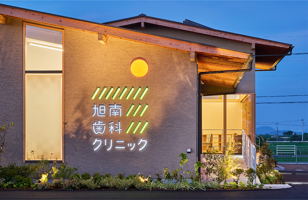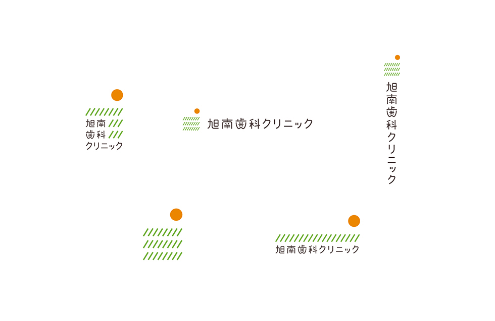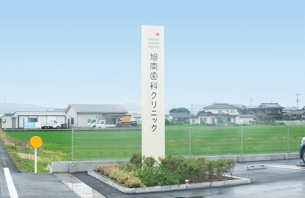 また、それらは医院の周囲が田んぼに囲まれていること、院長が兼業農家としてお米をつくっているということから、田んぼを想起させるデザインにもなっている、ロゴ上部にあるオレンジの「○」には、旭南歯科クリニックが患者さまの明るい未来を照らす旭(あさひ)のような存在でありたいという思いを込めている。