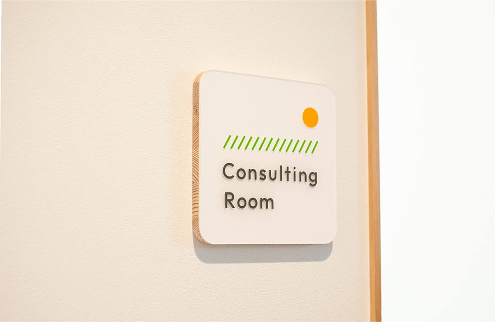 院内サインは、木材がふんだんに使われている空間に合わせ、サインにも木材を取り入れることで空間に馴染むよう仕上げた。