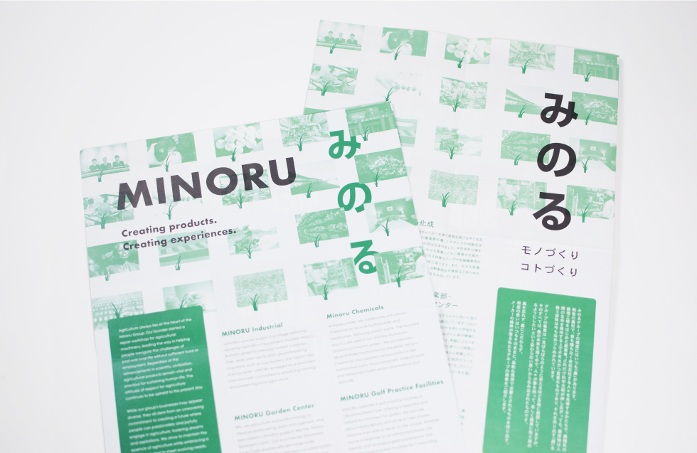 このリーフレットは「みのるグループはどんな会社?」と聞かれた時に少し踏み込んで紹介できるツールになるよう製作に取り組んだ。