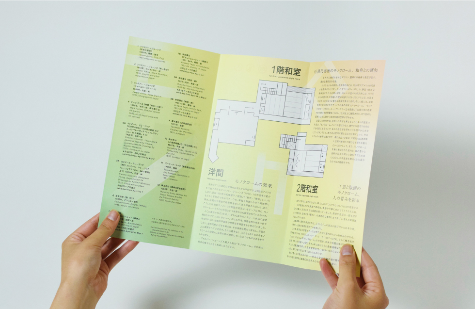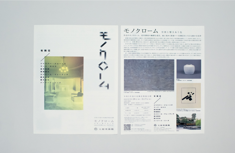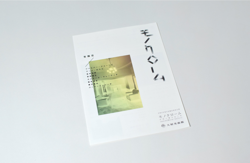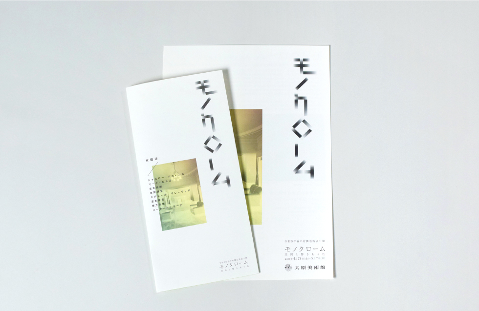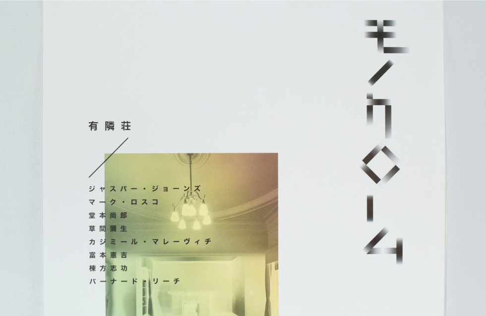 作品に込められた意図に思いを巡らせてほしいという展示のねらいを表現するため、「モノクローム」のロゴを製作し、メインビジュアルを構成した。