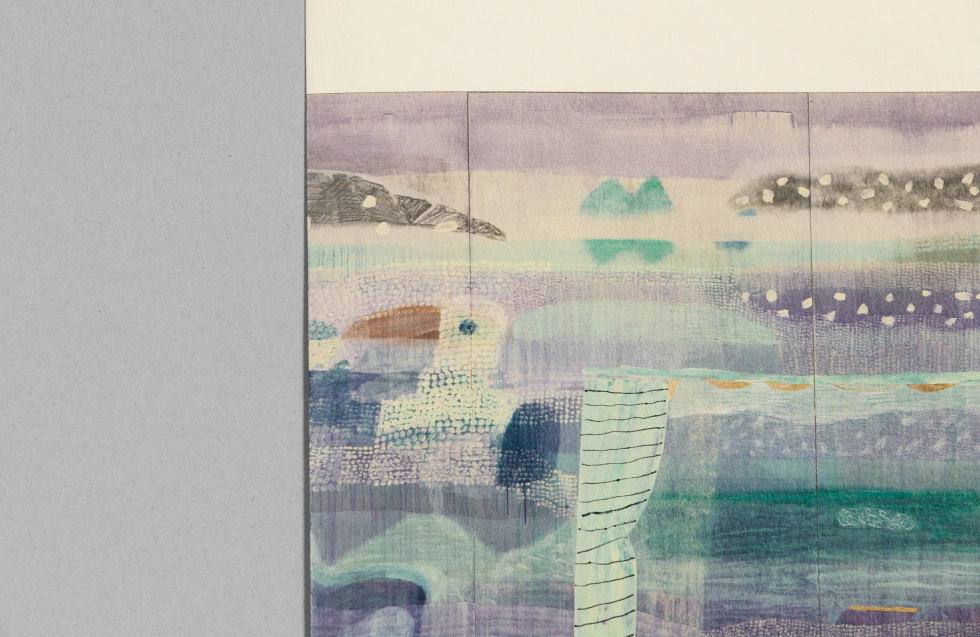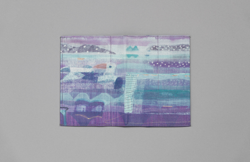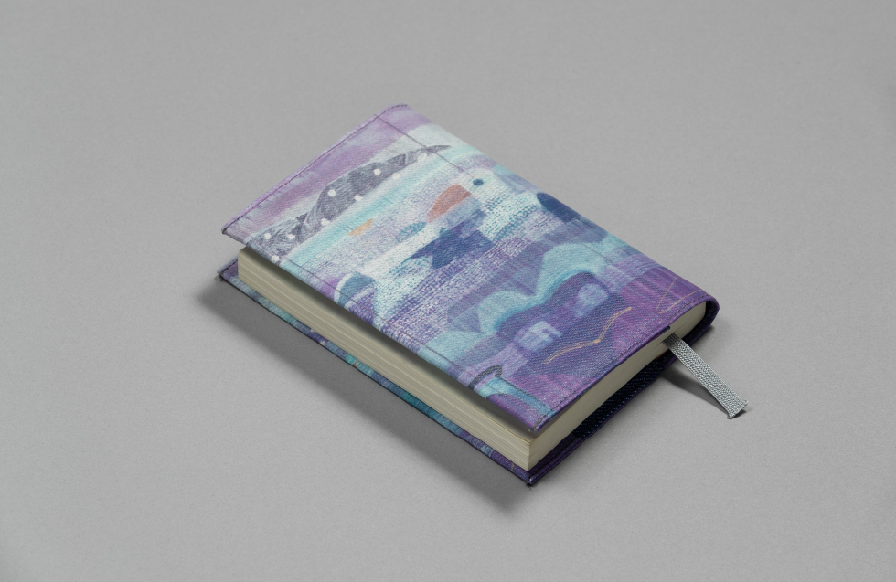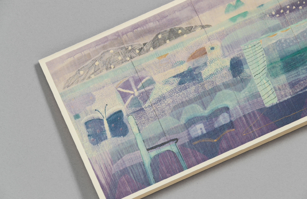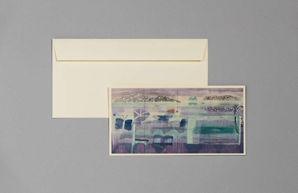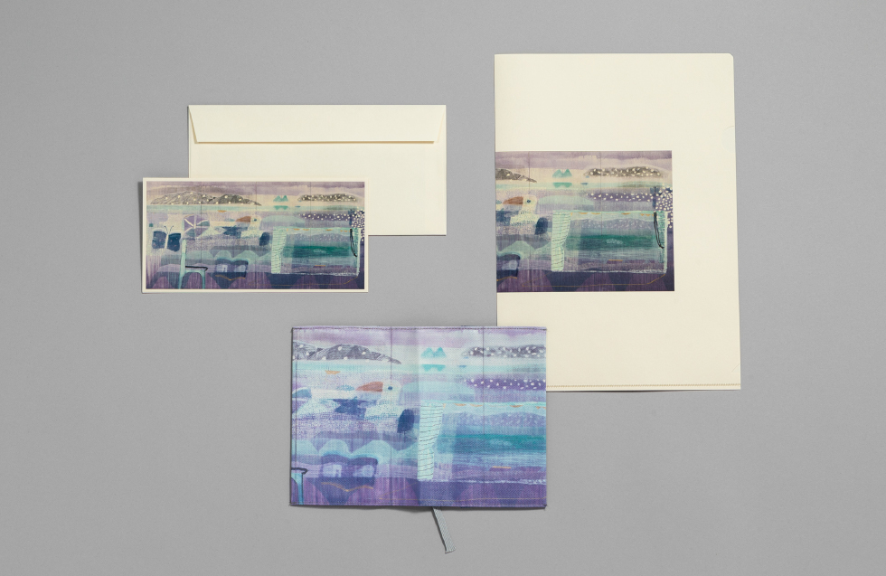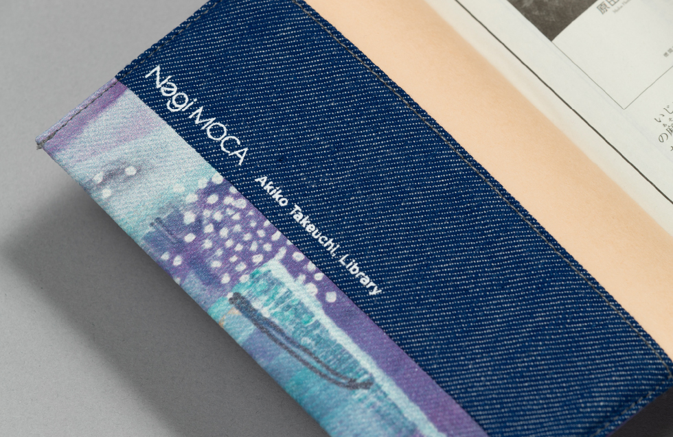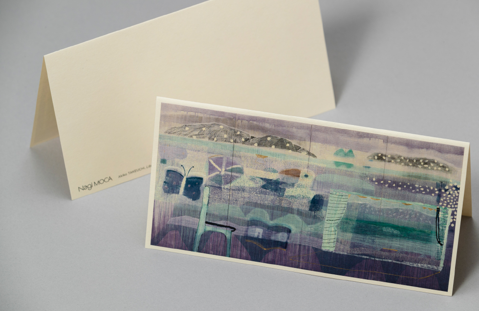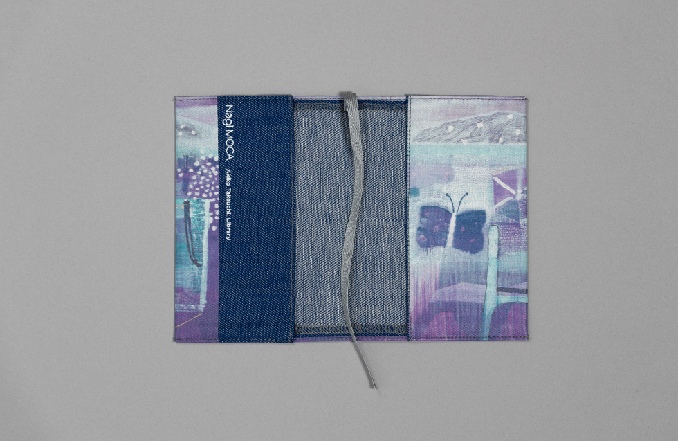 画家の武内明子さん(ワタリドリ計画)が、奈義町立図書館の窓から見える風景を題材にして描いた作品「ライブラリー」を用いて、ブックカバー、紙ファイル、メッセージカードを作った。