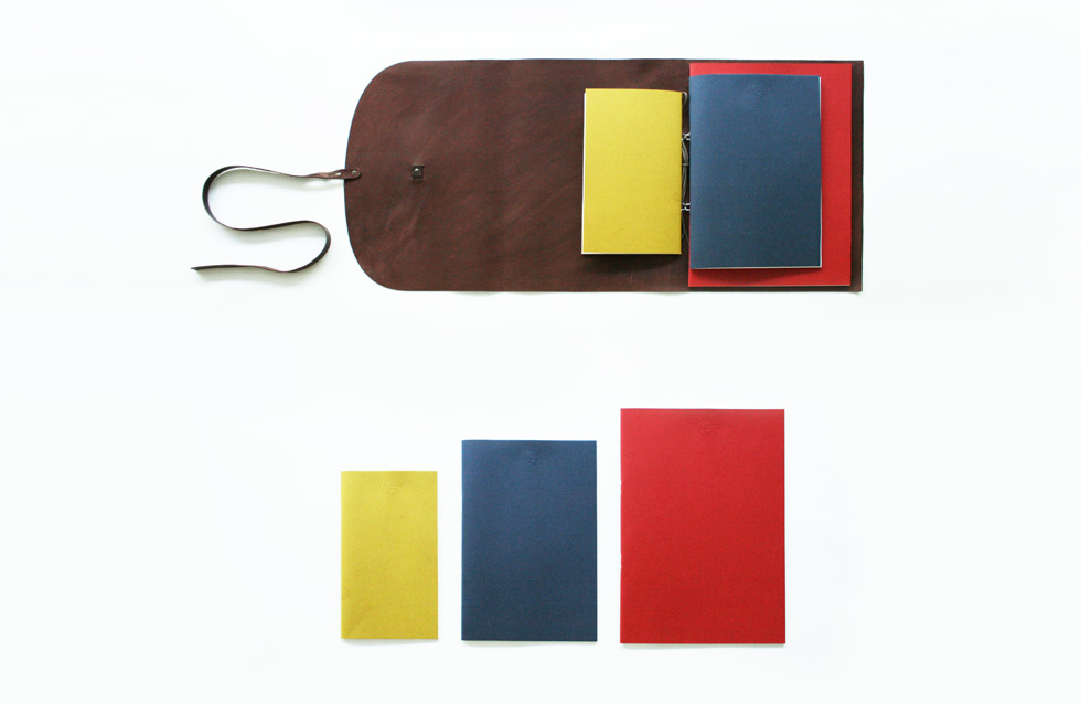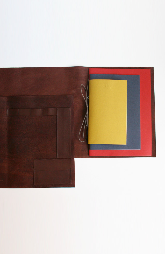 リングを紐でくくることでまとめることが出来るレザーカバーも制作。