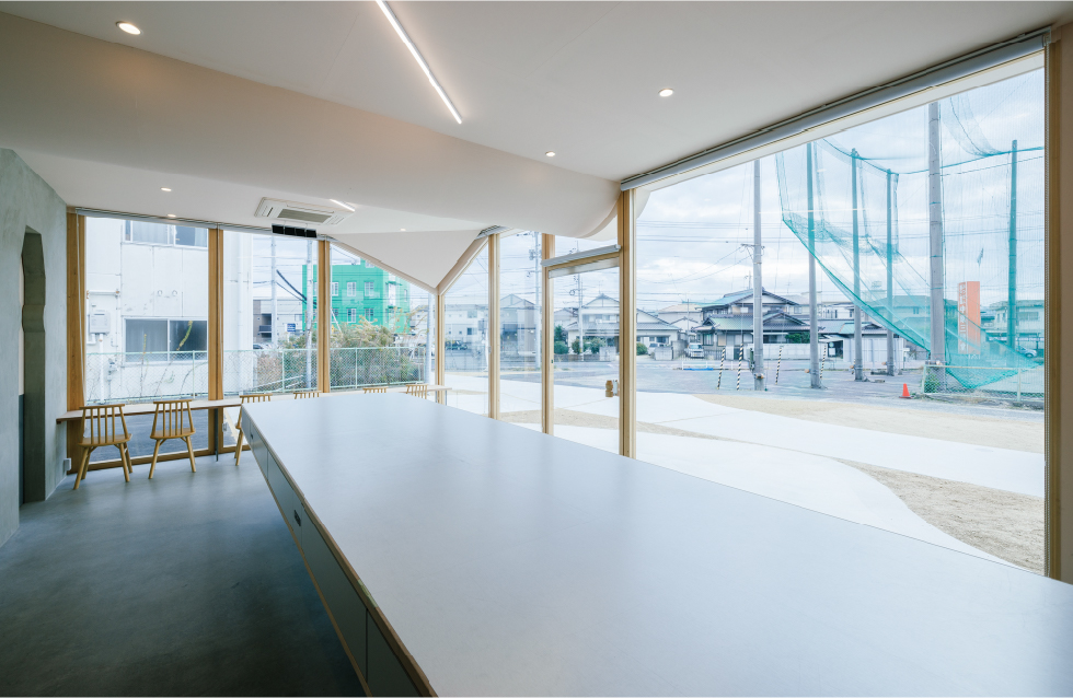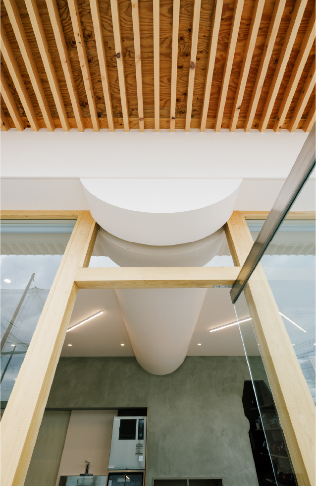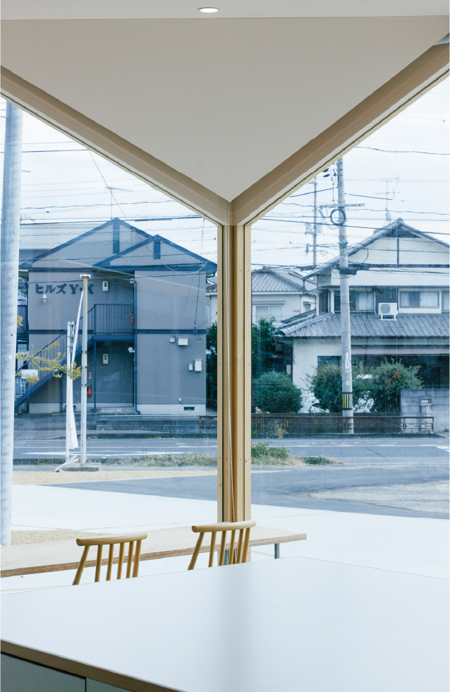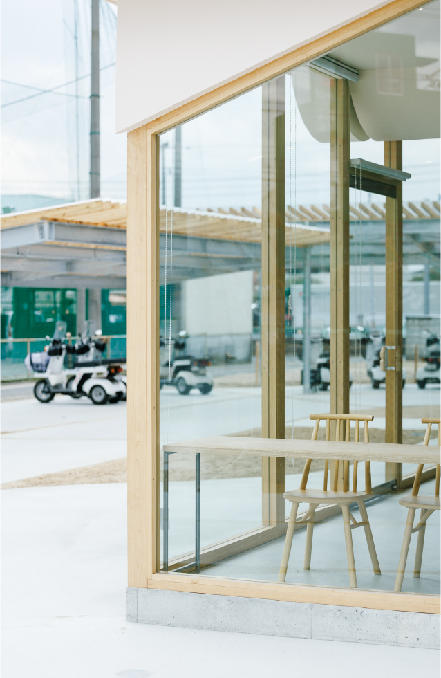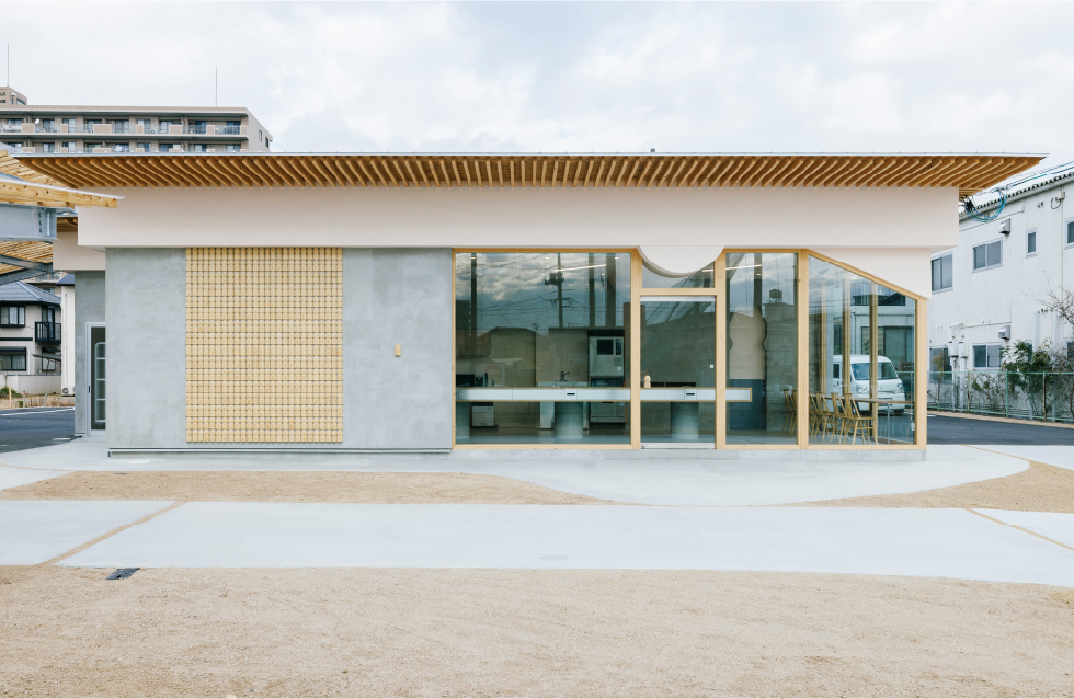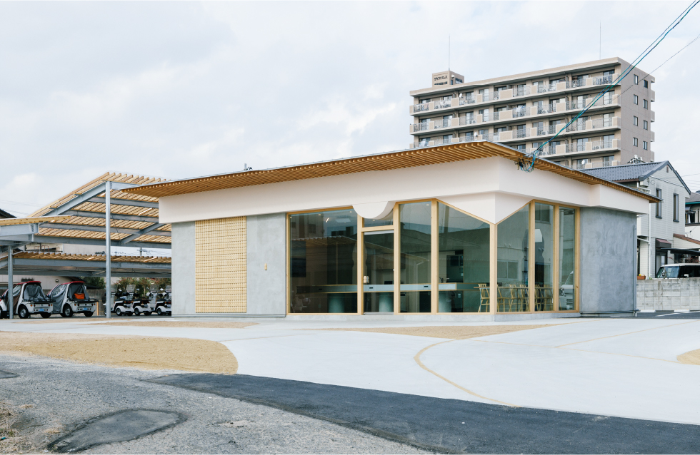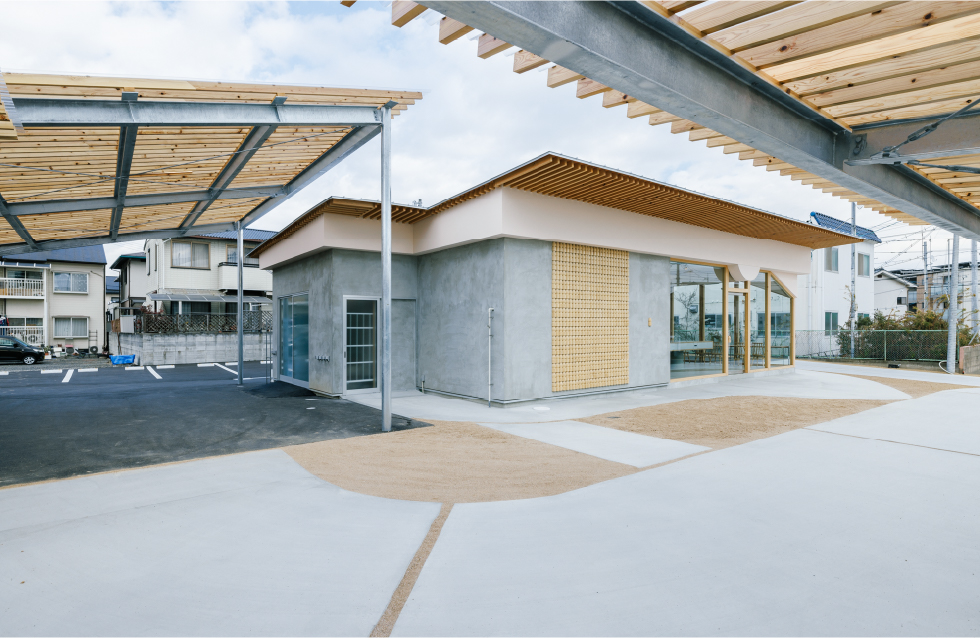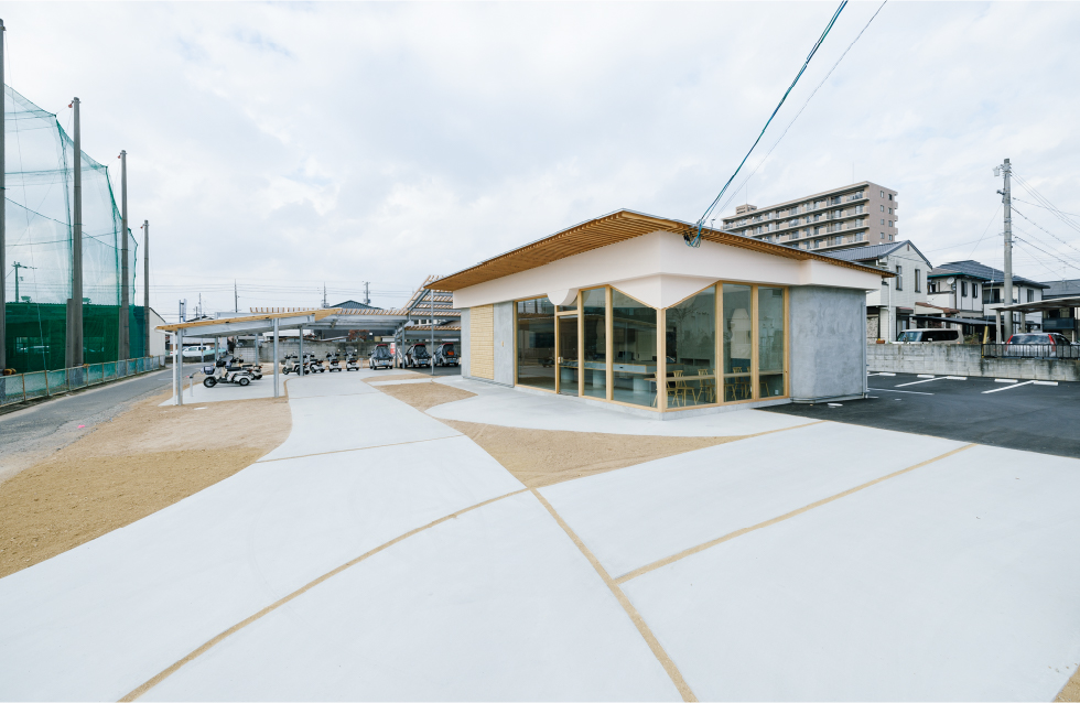 ヤクルトレディのバイクや電気自動車のポートの屋根を大きさや高さ角度を変えて複数レイヤードし、進入路も曲線的なアプローチでデザインすることで奥へと自然と視線を誘うことを意識した。