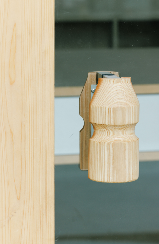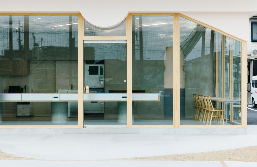 外装には岡山県産檜を削り出して製作したヤクルト容器のモチーフを埋め込み、建物内の扉や外から見た窓の形もヤクルト容器の比率のシルエットになっている。