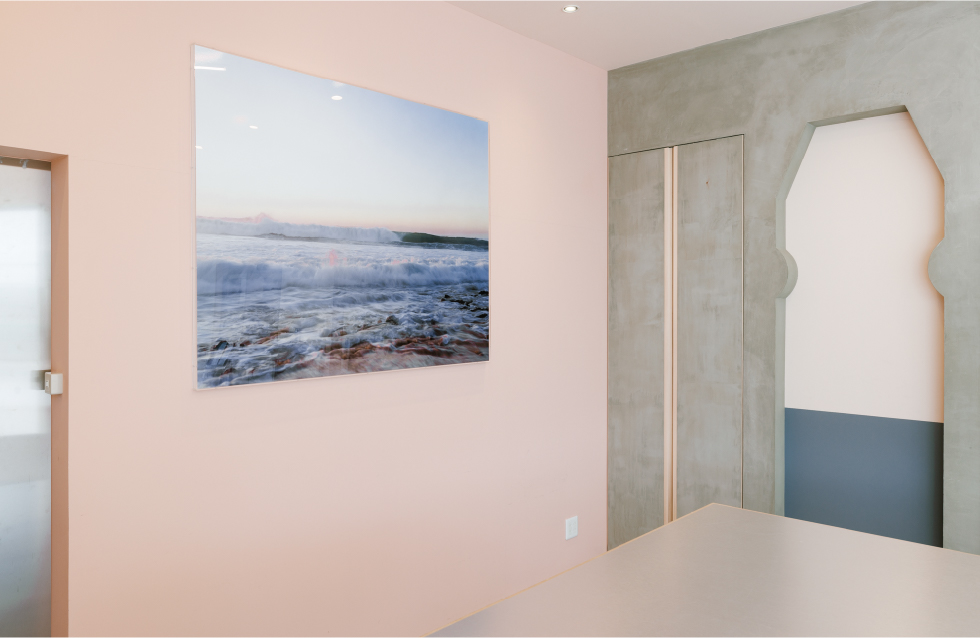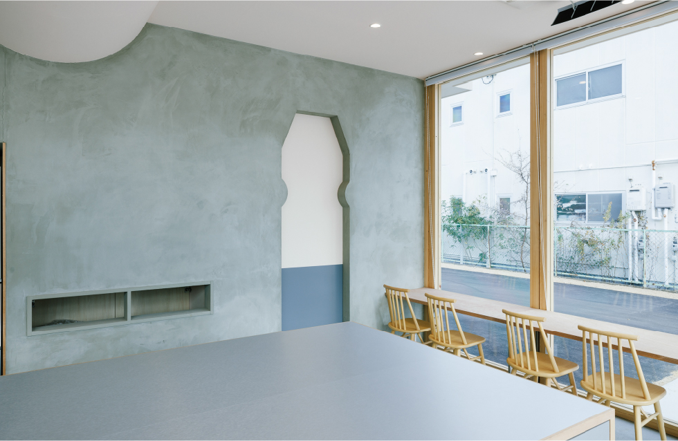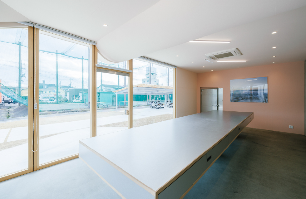モルタルを基調としつつ、ヤクルトの液体色から着想した柔らかい色も取り入れることでやさしさも感じられる空間に。