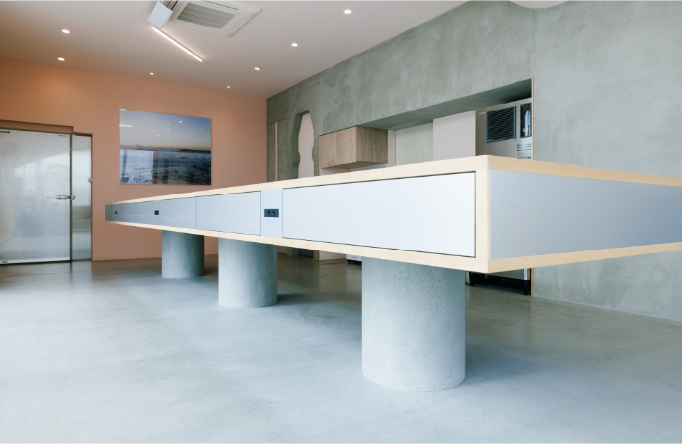 引き出しがついた大テーブルもオリジナルで製作。業務で使用するものをこちらに納めることで、空間の雰囲気を保つことができる。