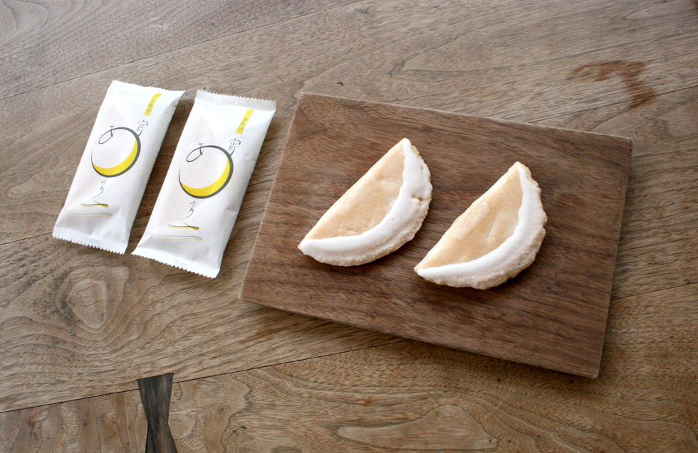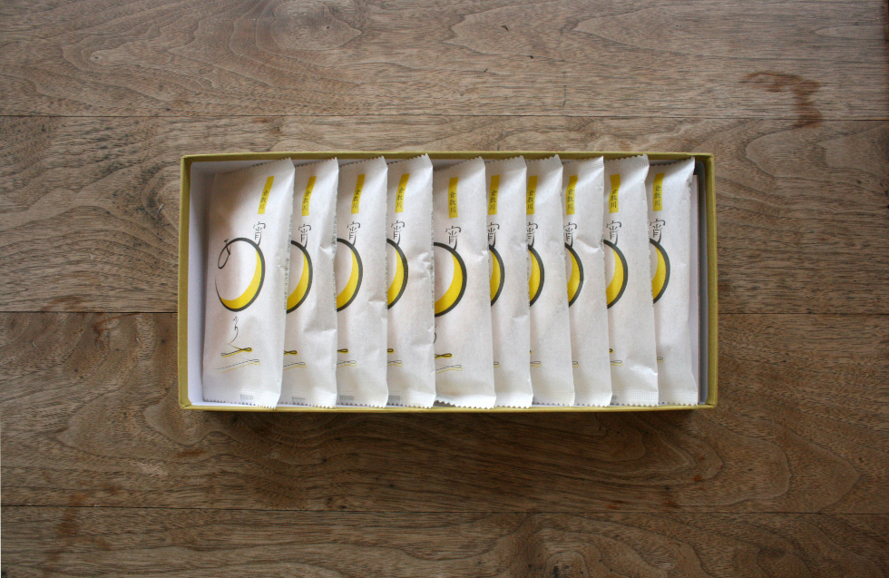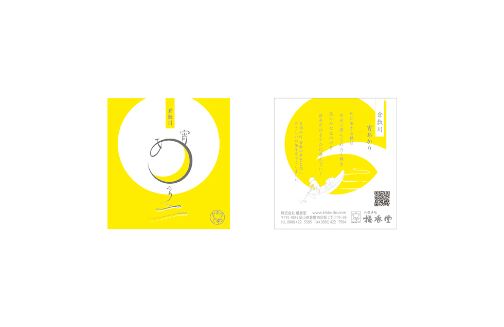 橘香堂の商品「倉敷川 宵あかり」のパッケージリニューアルを担当。アイキャッチを意識したメインのロゴは、すぅっと続いていく倉敷川の流れと、ゆらりと浮かぶ宵の白んだ月を表現している。お菓子の形を川を進む荷舟に見立て、全ての要素をコンセプトへ盛り込んだ。和菓子の上品なイメージ、宵明かり自体が持つ素朴な見た目に少し勢いを付けるように、カラーは明快なイエローを選択。既存の箱に商品を並べた時に、軽い黄色と中心の円形が全体をポップな印象にしてくれることを狙った。